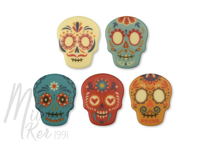 Mexikói koponyák, fehércsokoládé plakett, 60 db - -Halloween csokoládék és csokifóliák