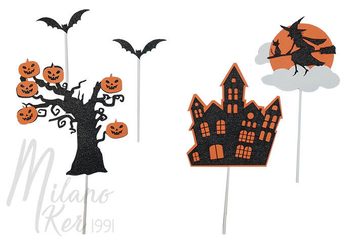 • Öt darabos torta beszúró garnitúra (tökfejes öreg fa, kísértetkastély, seprűn repülő boszorka macskával, denevérek