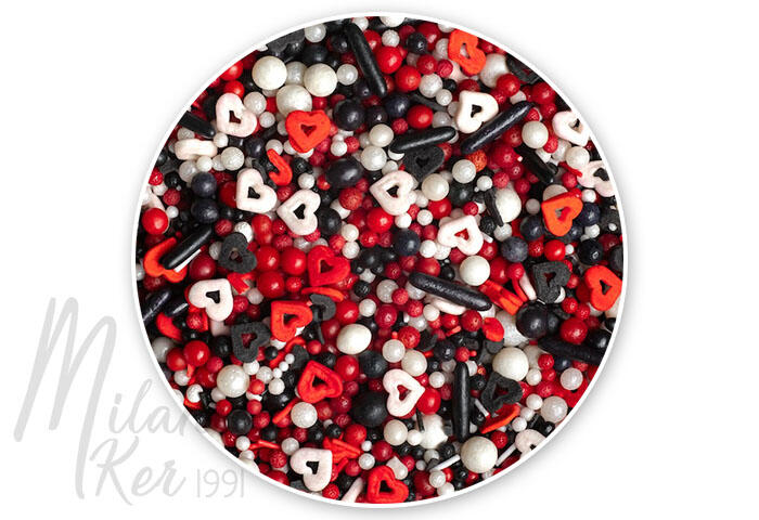 • Fekete–fehér–piros színű szórócukor válogatás vegyesen
